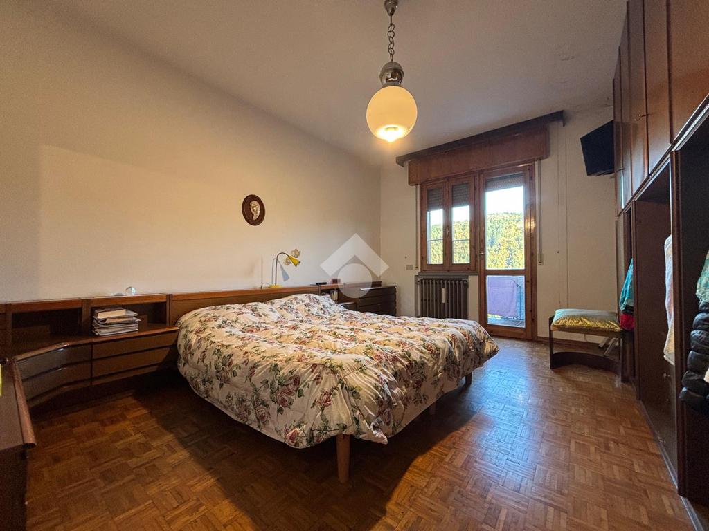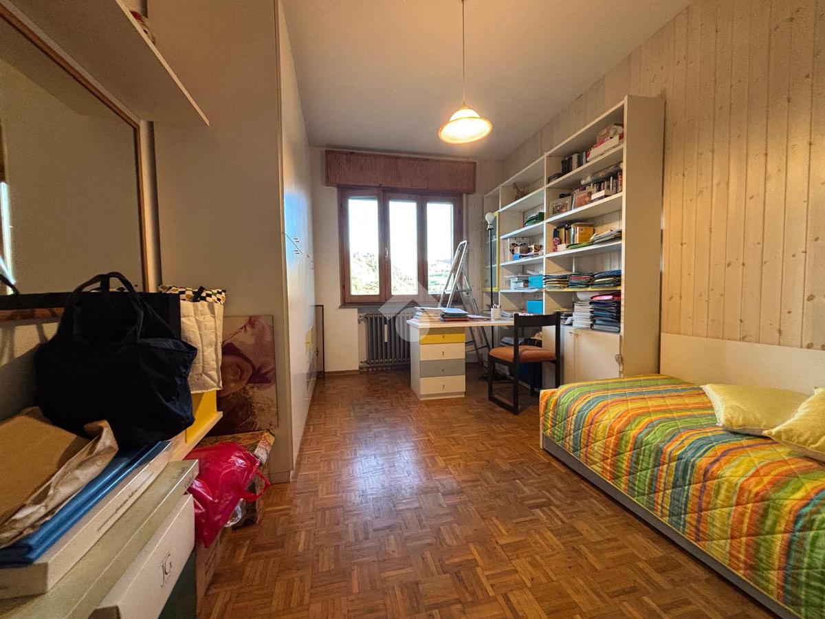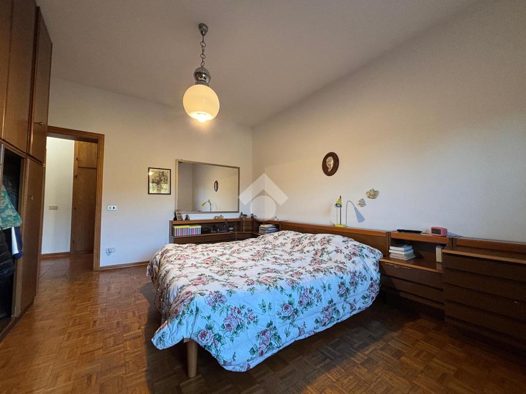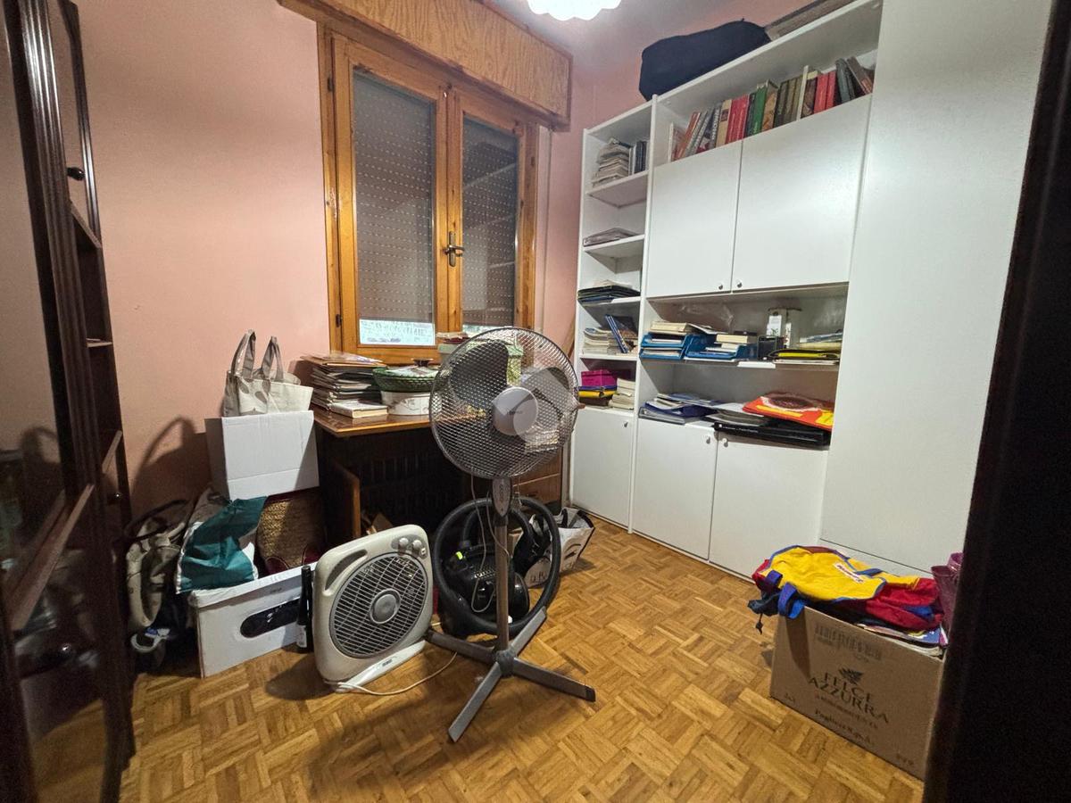 La zona notte comprende una camera matrimoniale tranquilla e confortevole, un bagno finestrato e un ampio ripostiglio, perfetto come cabina armadio o locale di servizio.