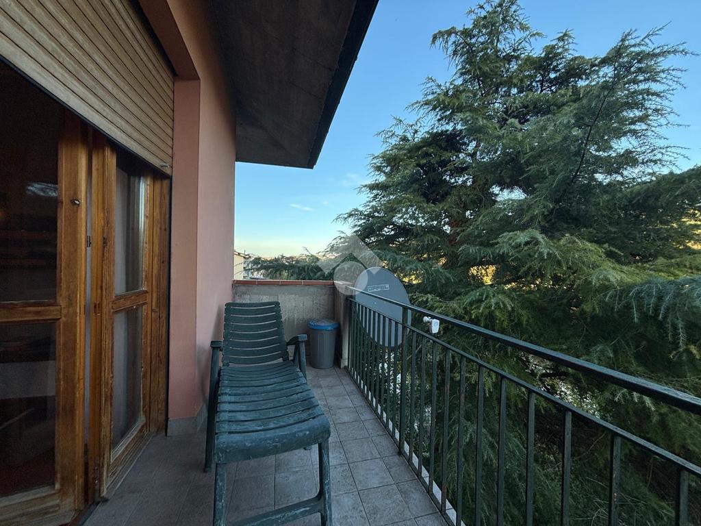Una porta finestra conduce al balcone esterno, ideale per concedersi un momento di relax all’aria aperta.