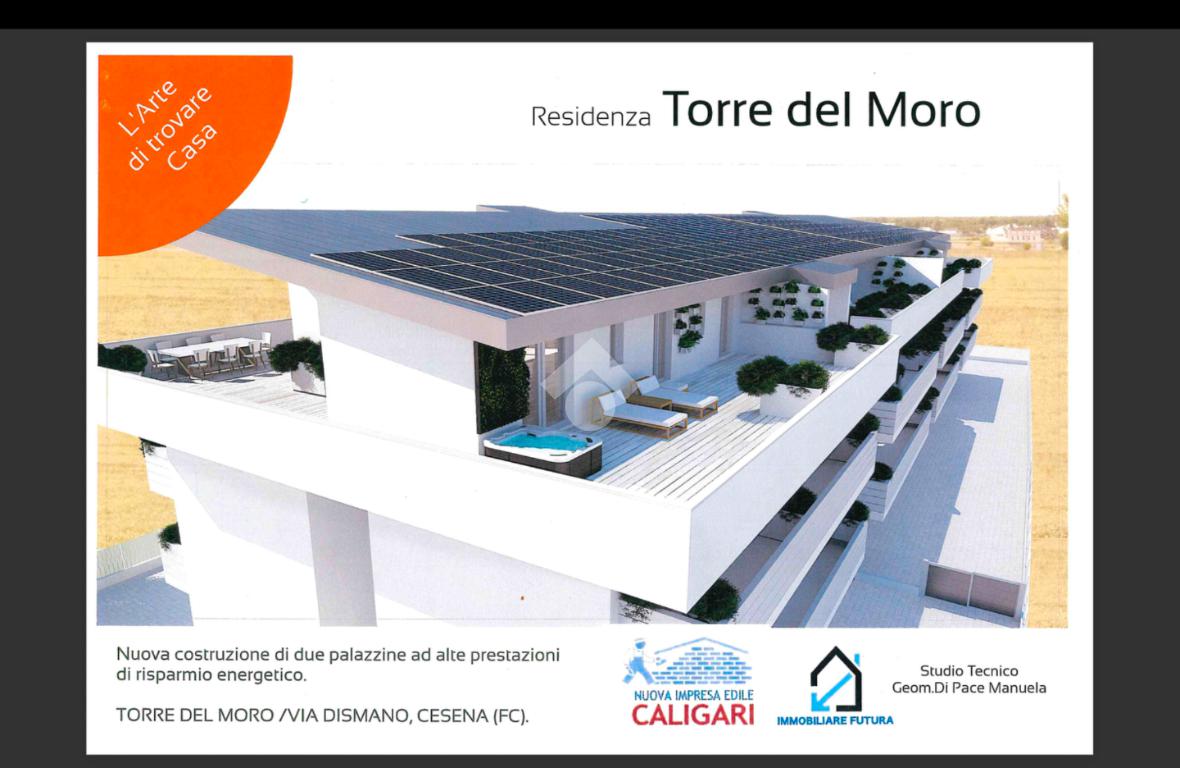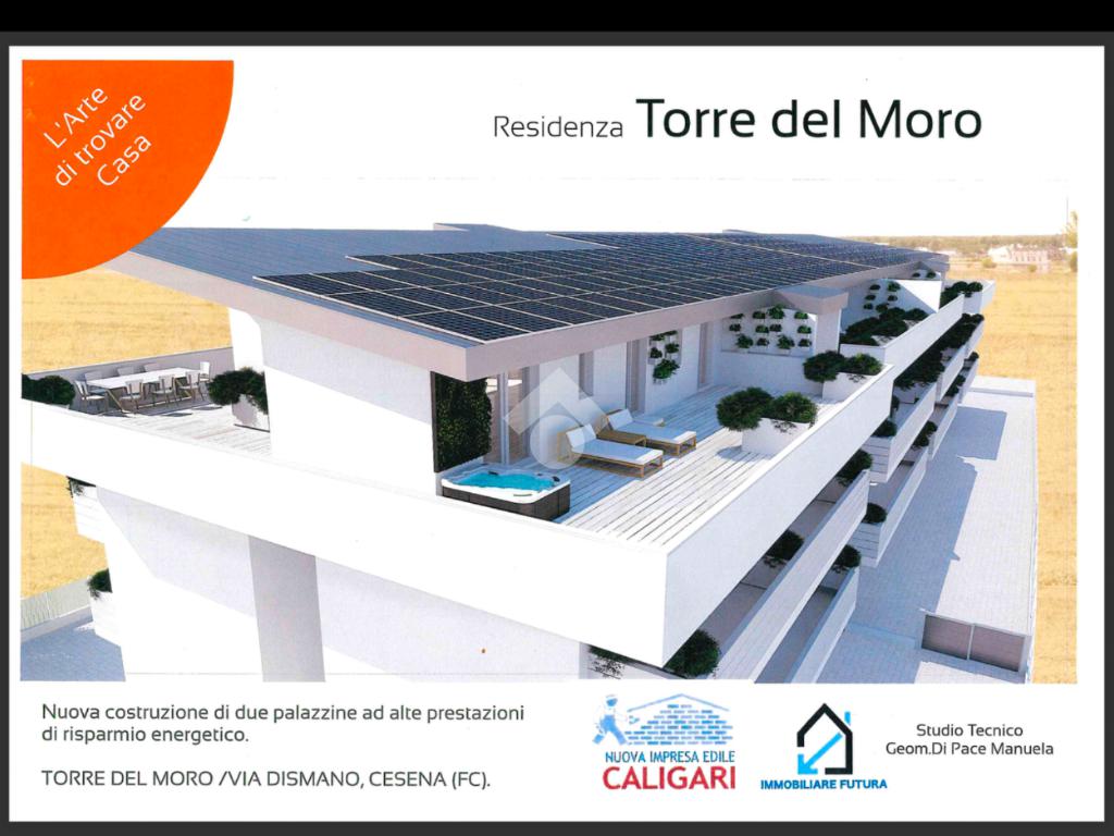 CESENA TORRE DEL MORO nuovo complesso residenziale di prossima realizzazione a poca distanza dal centro in un’area molto servita. Appartamenti con ottime finiture ad alta efficienza energetica al piano terra con giardino, oppure al piano primo e secondo con terrazzo di mq 30, serviti da ascensore, oppure attici con terrazzo panoramico di mq 170. Le abitazioni sono realizzate in opera con un'altissima efficienza sismica ed energetica (classe A) con tetto in legno ventilato, riscaldamento a pavimento, pannelli fotovoltaici 4 kw per ogni appartamento, ventilazione meccanica controllata, impianto di climatizzazione e d’allarme installato, infissi esterni in PVC con vetri a taglio termico e tapparelle elettriche, impianto di aspirazione centralizzata e cassetta di sicurezza. Possibilità di personalizzazione degli interni nelle finiture e negli spazi. Ogni unità abitativa dispone di garage e posti auto. Ideale per famiglie che ricercano ampi spazi interni ed esterni abbinati all’efficienza e al comfort che offrono le costruzioni nuove. Fine lavori dicembre 2026.